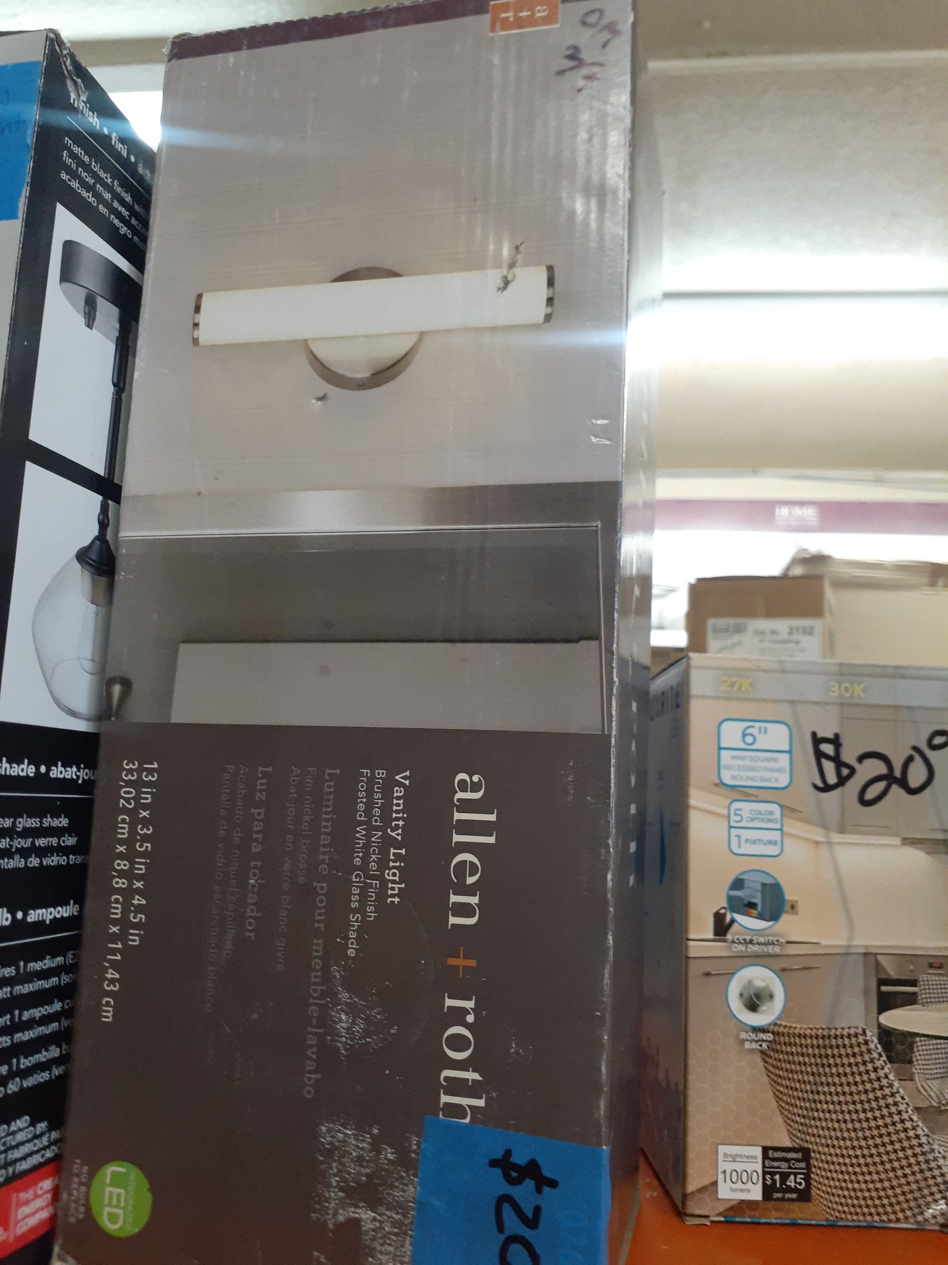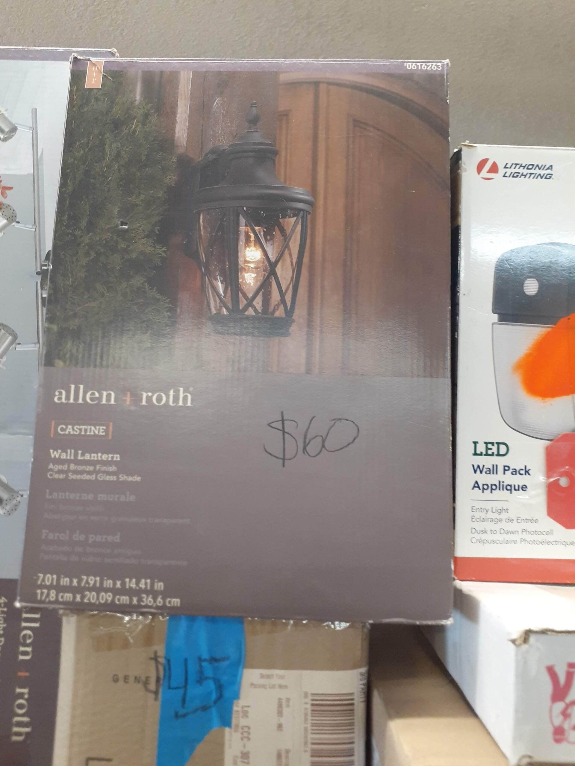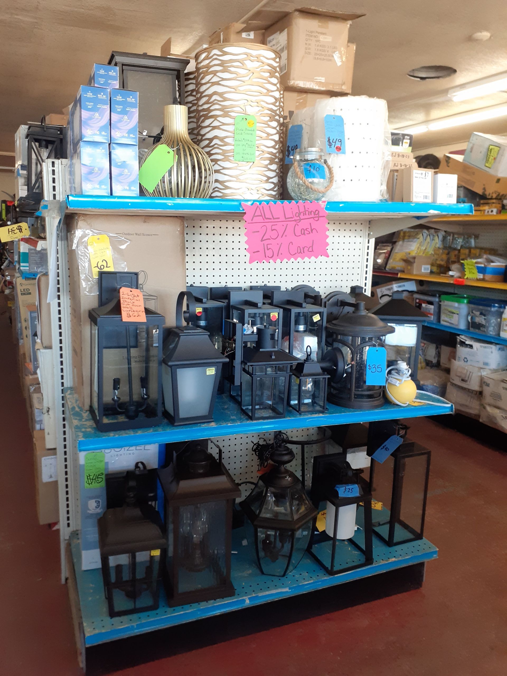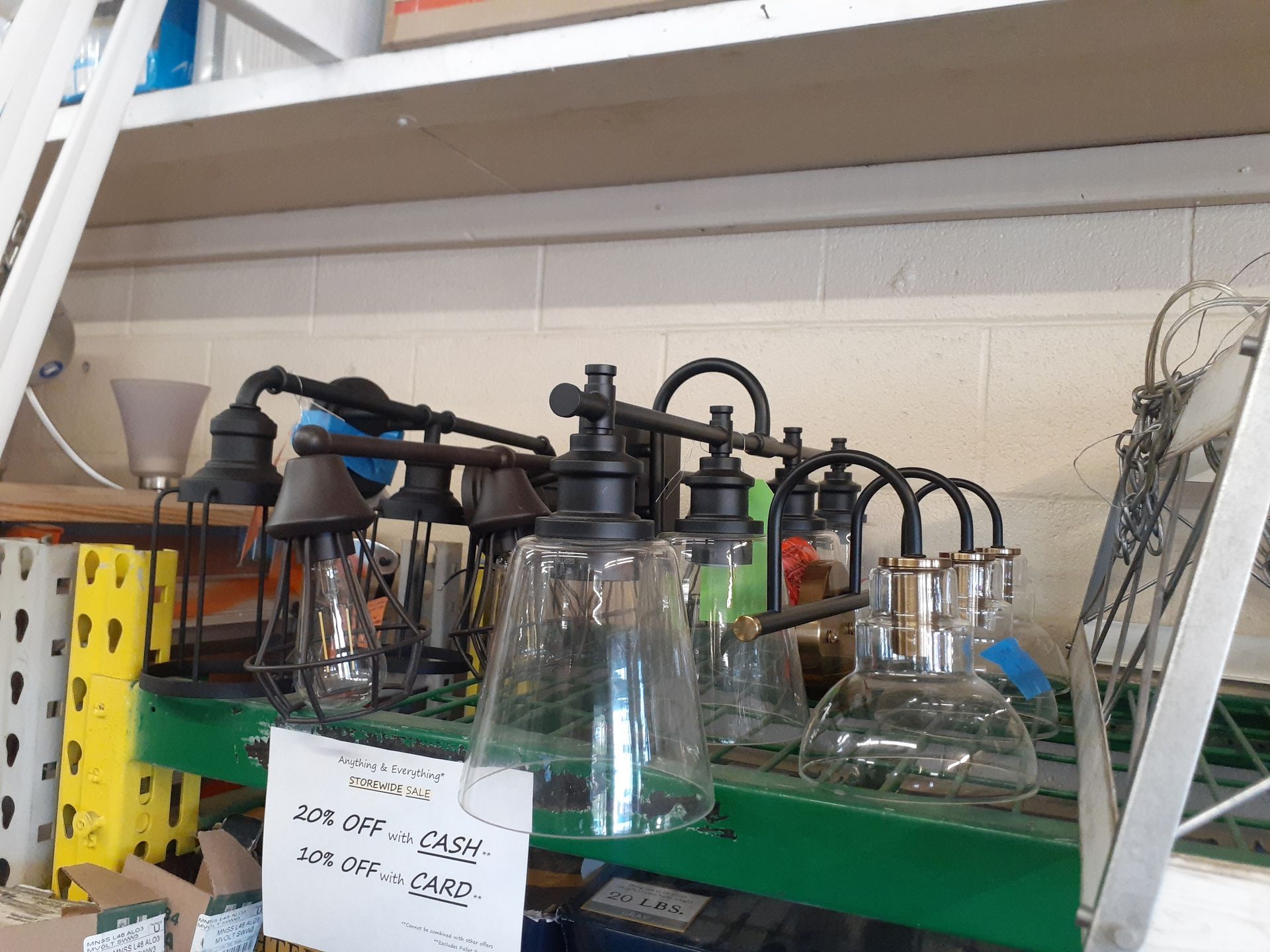 We have so much more than we show here! Most of our lighting is priced half off of retail value! Most brand new in the box, some out of the box. All are warrantied! Bathroom Vanities, Wall Sconces, Lighted Mirrors, Chandeliers, Outdoor Lights, Porch Lights, Security Lights, Can Lights, Kitchen Lighting, Path Lights... and MORE!!!